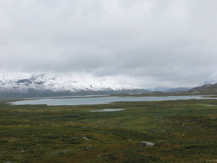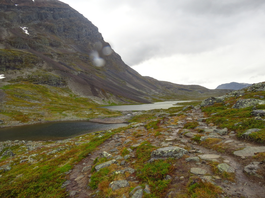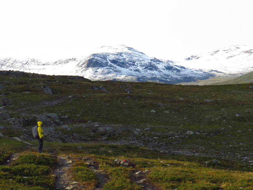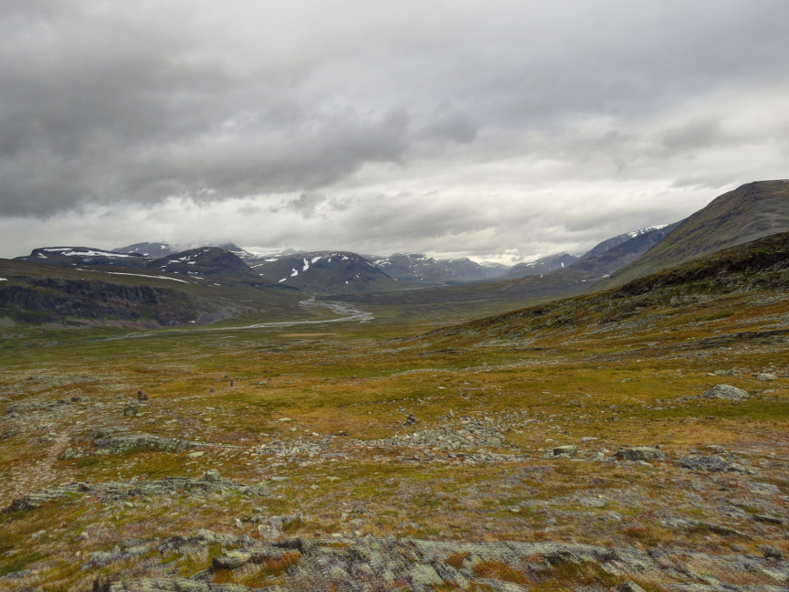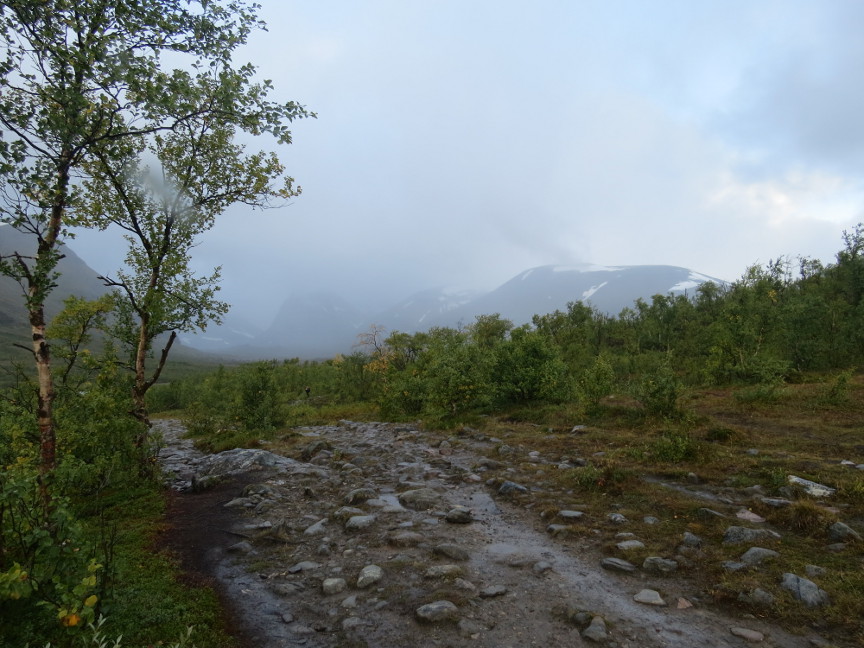 way down the trail. But fortunately we never saw them again! Kungsleden Day 2 Today was one of the longer stages - we had to hike 21 km to the Alesjaure hut. We started exactly at 8 AM. It was already drizzling at the start, not pleasant hike weather. It was also quite cold, during the