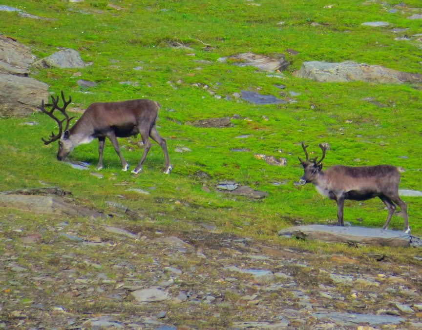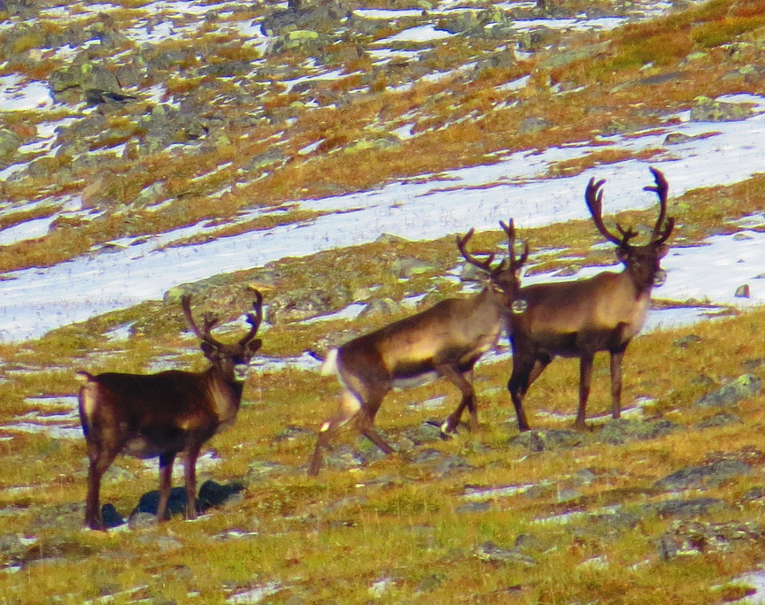 Today we saw our first reindeer. The reindeer were up ahead on the hills. Briefly, they stopped on the ridge and were easily visible against the sky, but then they ran over the hill and disappeared.