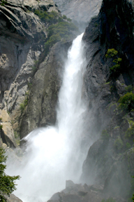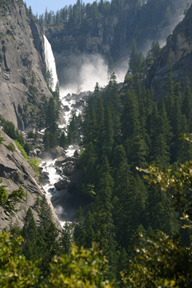 At last we reached Vernal Falls! The roaring of the water was easily heard long before we reached our destination. Like all the other waterfalls, Vernal Falls had enormous amounts of water rushing over. After having seen it with barely a trickle of moisture some years ago, it was amazing to see such a huge supply of rushing water! It had great force also. Even the very large boulders had been partially submerged by the force and volume of the water.