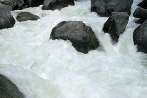 We went first to Bridalveil Falls. It did not resemble a veil at this time, because the unusually heavy snowpack of last winter was melting, making all the waterfalls run spectacularly full. This was probably the reason for the huge number of visitors to the park on what is usually a quiet weekend. We parked along the road, since we had missed the entrance to the parking lot, and walked up to the falls. The stream away from the falls was full to overflowing, as were most of the streams, rivers and waterfalls. It was impossible to reach the customary view point, because the paved trail had become a river. I was hesitant to expose my digital camera to so much moisture, so took only a few hand-held film shots looking up at the falls.
