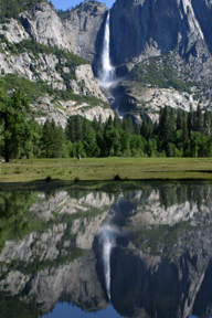 Not far down the road we actually found a parking space near Swinging Bridge. The Merced River had so overflowed its banks, that the usual riverbank was inundated with still water which had no place to go. In this still water was a reflection of Upper and Lower Yosemite Falls. The bridge was lined with people taking pictures and walking back and forth, but there were two photographers photographing the reflection of the falls. I set up slightly behind one of them, and began to photograph this incredibly beautiful scene with every technique I had.