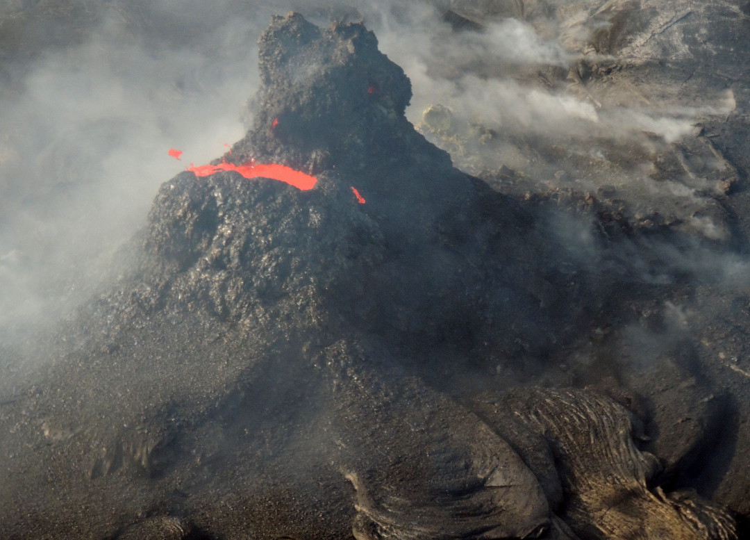 The helicopter lifted off for our Circle Island tour with Blue Helicopter. Our flight swung out over the ocean before heading inland. We could see houses and old lava flows below us. The pilot took us in closer where we could see the roof of a house of people who refused to evacuate. The house had been buried up to the roof line with lava.As we approached the active vent, we could see trees burning from active lava. At the vent itself we saw lava churning and splashing!