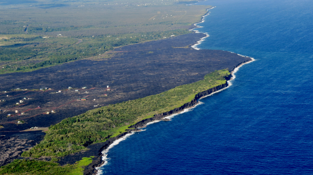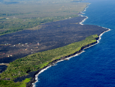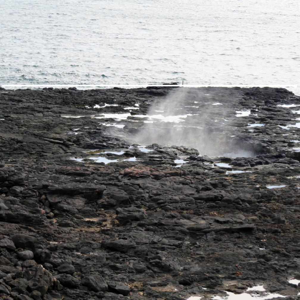 Along the ocean shore, it is still possible to view old lava flows. In one place it formed a hollow tube where some of the lava cooled before the rest, leaving a blow hole, which opens into the ocean just at sea level. Therefore, the waves break over the entrance to the tunnel, pushing the air ahead out the opposite end, making a smooth or hissing sound. It has become another attraction to visit, called The Spouting Horn.
