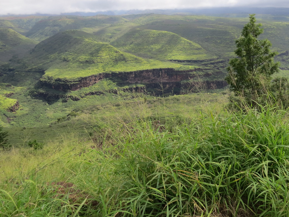 Kauai also boasts that it has “The Grand Canyon of the Pacific.” Continuing on, we began to see miles of greenery with many rocks and unusual formations. Unfortunately, we could see only glances, because of the many clouds obscuring the view. There were indeed canyons, and the rocks were beautiful. However, the road was single lane, and steep with sharp turns. There were few openings to park and admire the beauty. At last we reached the top, and searched eagerly for a beautiful scene. Alas, there was only more clouds, which began to do what clouds do – rain. Then it began to pour! I have a distinct memory of lunch at a restaurant at the very top, with rain coming down by the bucketful.