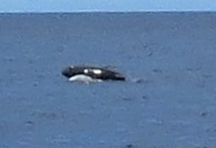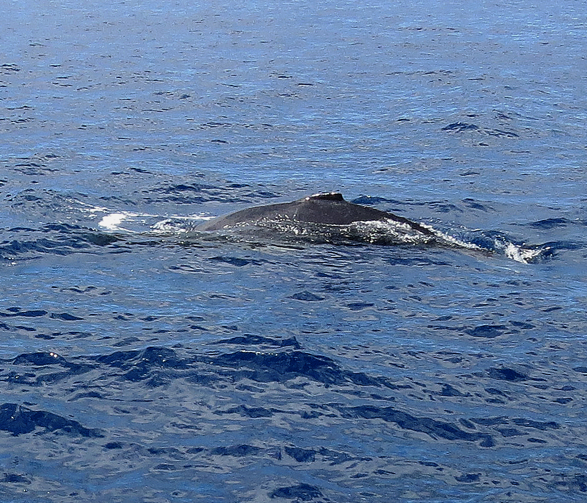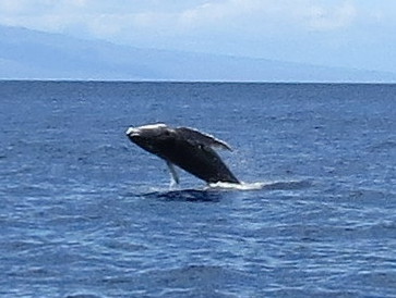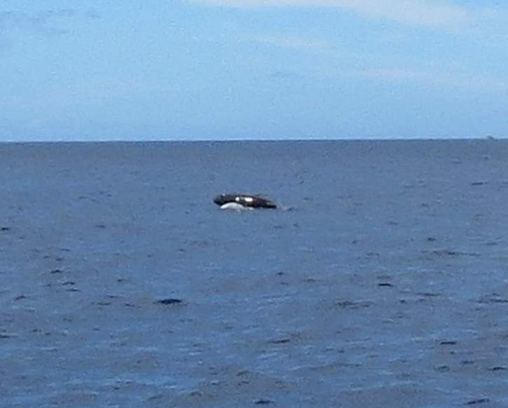 It seemed a long time before anyone saw a whale. It began to rain, and we were thankful to have brought our rain gear. We spotted a few, huge splashes of tail flukes, on the other side of the boat. We moved to the other side, but the whale passed under the boat and so we rushed back to our original side of the boat. Grabbing my camera, I watched where it had dived. Fortunately I had my 50x zoom, and was prepared when he “breeched” (meaning to leap out of the water). I was thrilled to catch him in the top of his leap. It was a WHALE BREECHING!