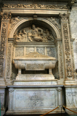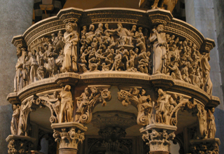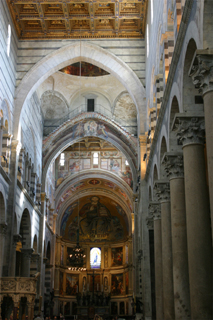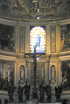![]() Interior of Pisa's Duomo ![]() ![]() ![]() The Duomo's pulpit, carved in the14th century by Giovanni Pisano. ![]() ![]() Chapel altars inside the Duomo ![]() ![]() The main altar and the tabernacle In another area of the Duomo was another beautiful arrangement of a beautiful stained glass window to the Blessed Mother ... ![]() ...a crucifix in front of the stained glass window... ![]() ...an angel at the edge of the group holding a candle... ![]() ...and above a door was this lovely depiction of the coronation of Mary. ![]() We did not have nearly enough time to explore this church thoroughly, but it was certainly beautiful and worthy of another visit ------some day!