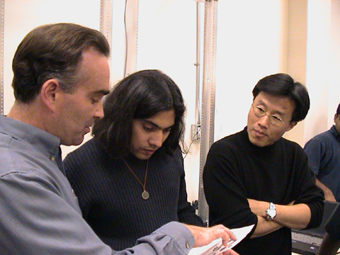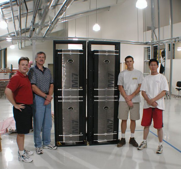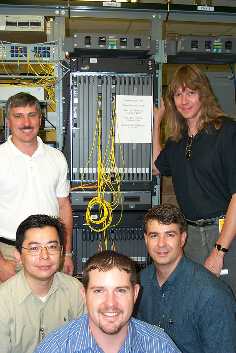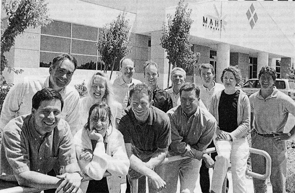This black and white photograph was published in Sonoma Business in September 2000, with a story titled: Mahi Networks:One of the next Telecom Valley success stories? Series B had already closed, and the employee population had risen above 100. Shown here (front row): Jose Enciso, Liz Leland, Mark Thomas, Bill Beyer, Katherine Radeljic, Ramone Hecker. (back row:) Kevin Pope, Kathleen Keith, Colm O'Brien, Greg Peters, Dennis Maddock and Jim Nowack.